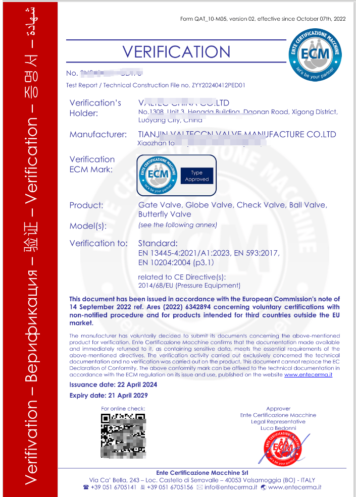 或者是意大利ECM機構發(fā)的PED 4.3證書,如圖:
