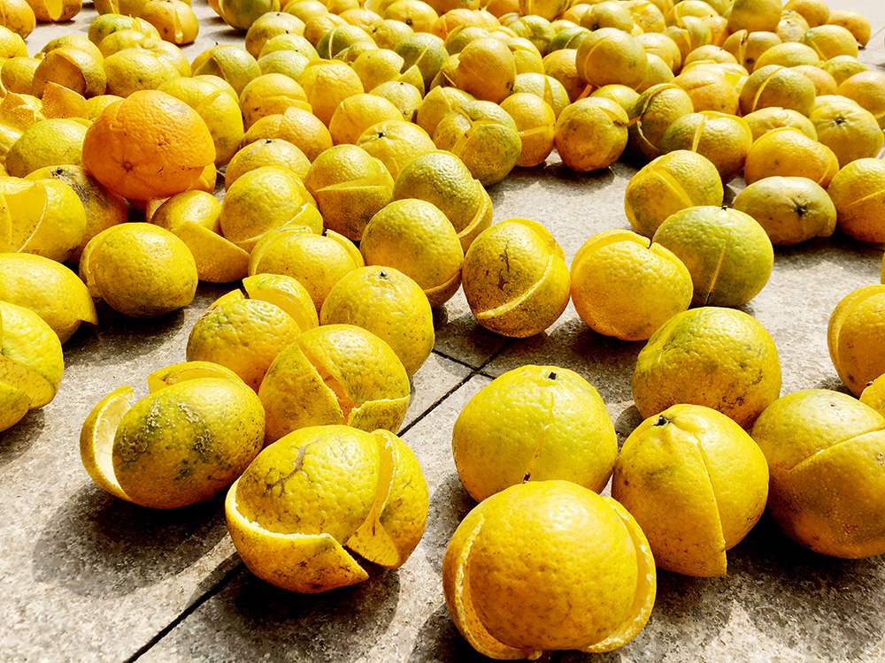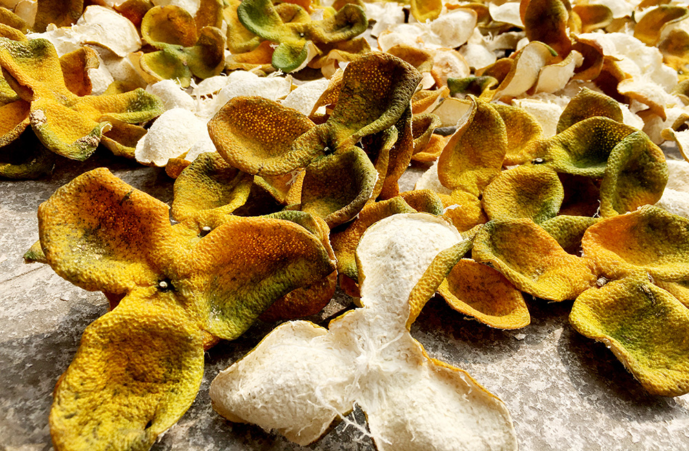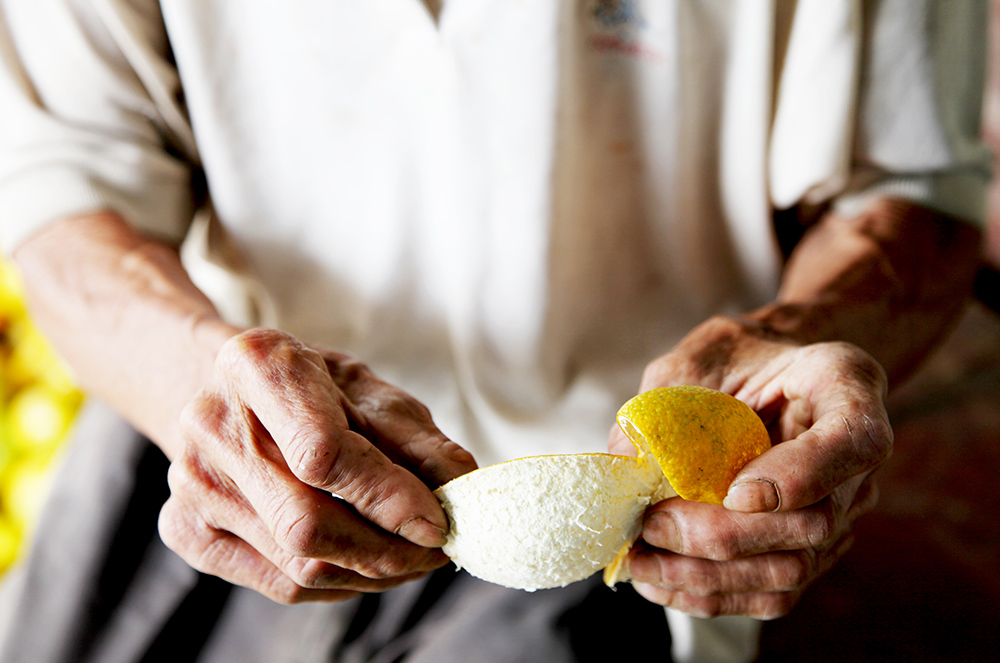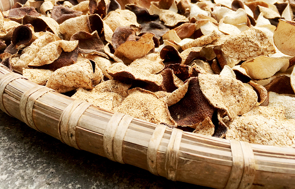 何伯說,陳皮就要在水泥地上平鋪開,讓太陽自然而然的曬,自然曬干的陳皮,吸收了太陽光的干爽,自然脫水并收縮,入罐或者是入箱封存,這樣才不會發霉,想吃或者想煮時候,拿出一塊,洗干凈皮囊,就可以了!