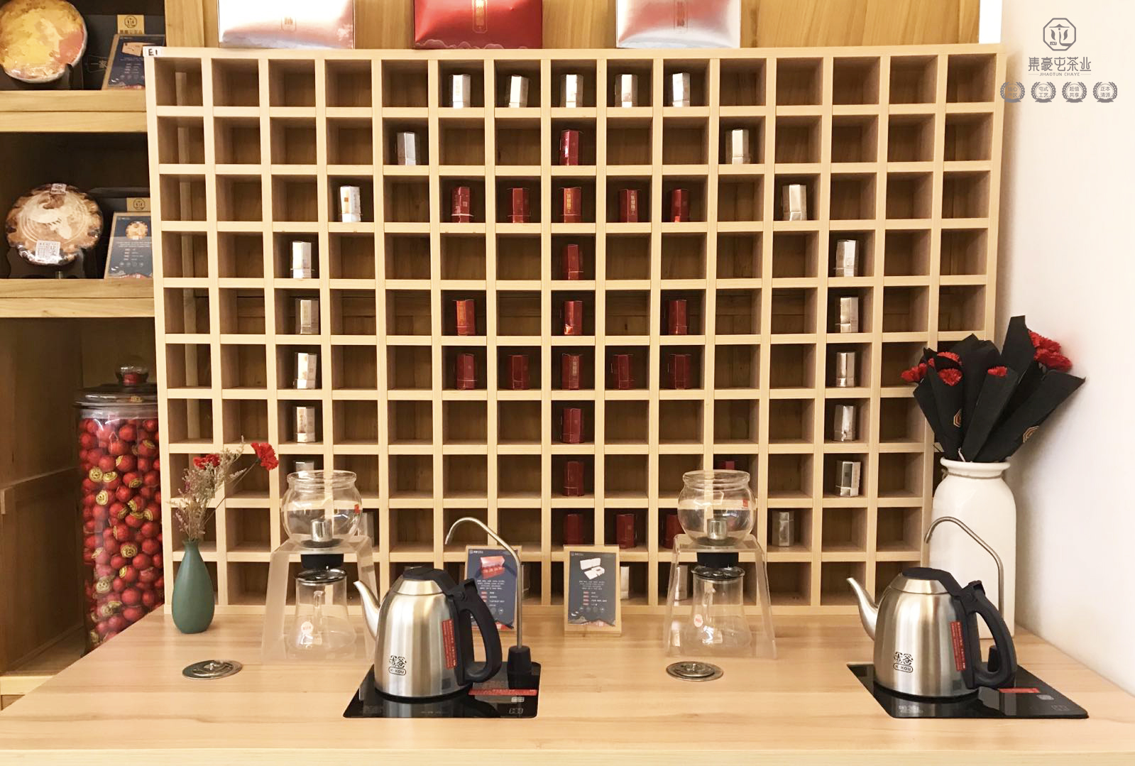 走進之后馬上有人接待,我細細地看著展柜上陳列的茶品,還有由茶品陳列出來的大大的“屯”字。經店員介紹,我知道了那一筒筒的小茶品叫做集相隨。那一個個大桌子,叫做共享茶臺。