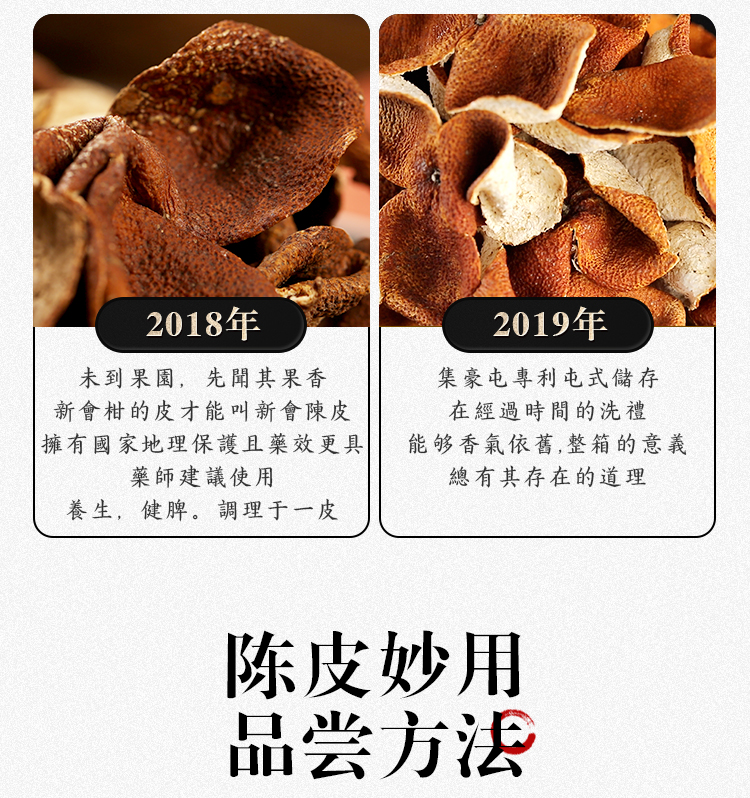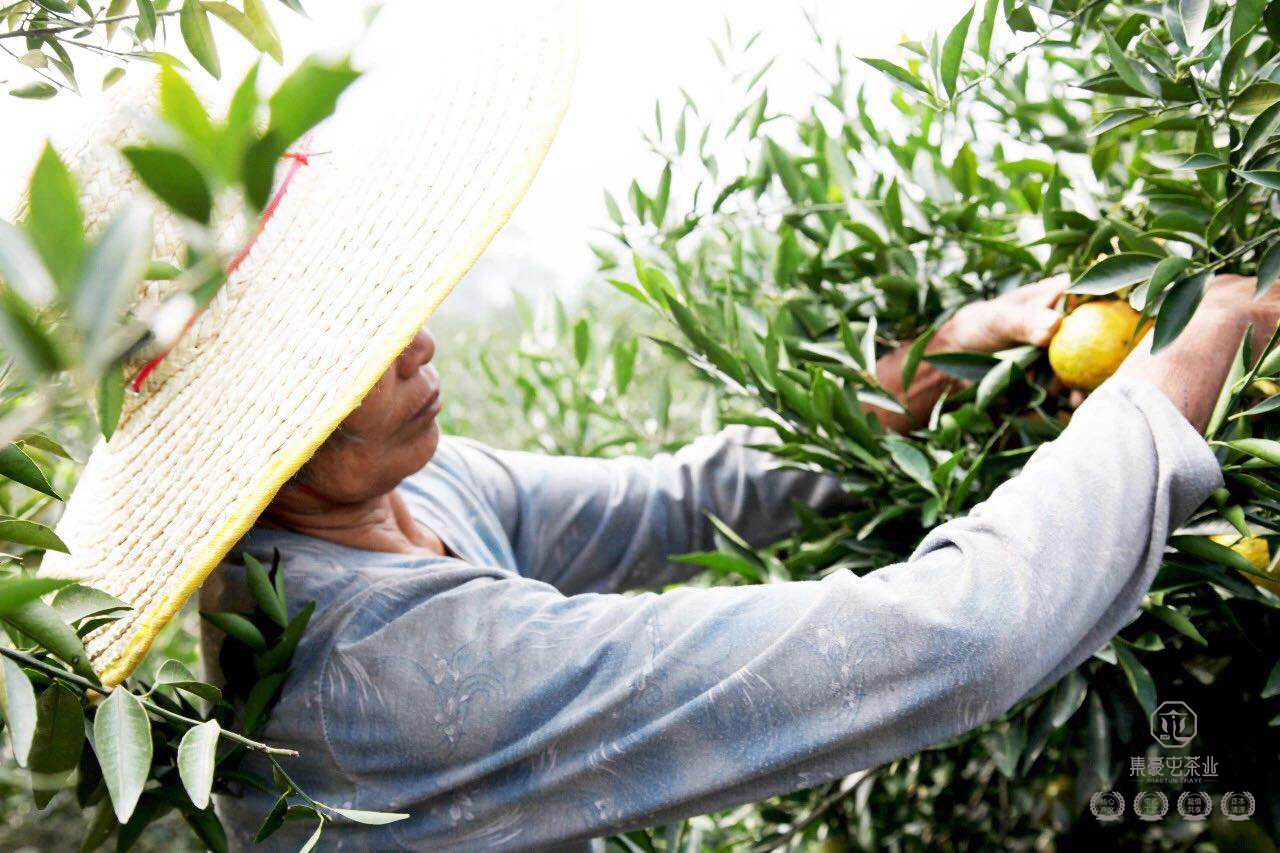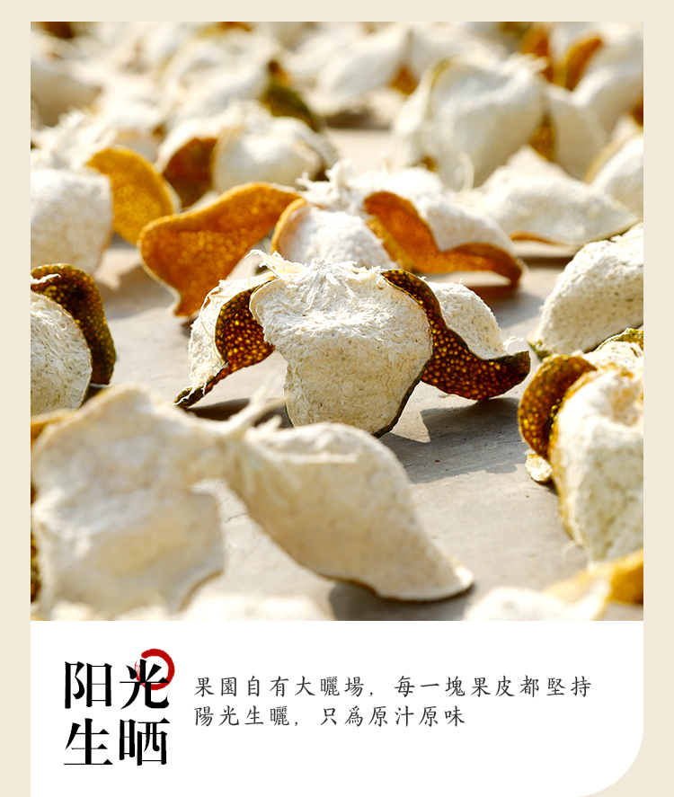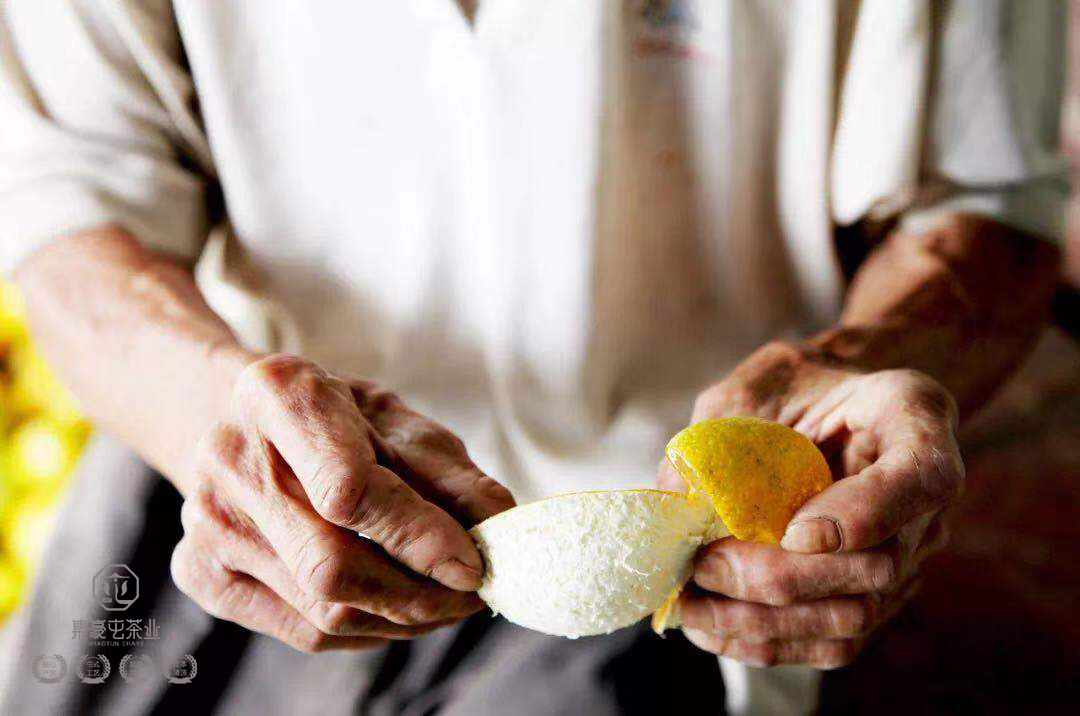 核心產區一線茶坑村的何伯,在見到他的時候,正低頭在翻果皮,那雙帶著歲月的手,熟練的撿起一塊已經有點軟的果皮,根據果皮的中心點,輕輕的按下,一片果皮,就翻好了。